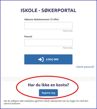 Du må logge deg på med ditt personnummer. Har du ikke brukt iSkole før, må du trykke på "Registrer deg" for å komme videre. Systemet husker deg til neste gang, og det er lett å rette opp eller endre noe i søknaden din.